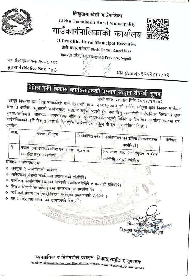 विभिन्न कृषि विकास कार्यक्रमहरुको प्रस्ताव आह्वान संबन्धी सुचना