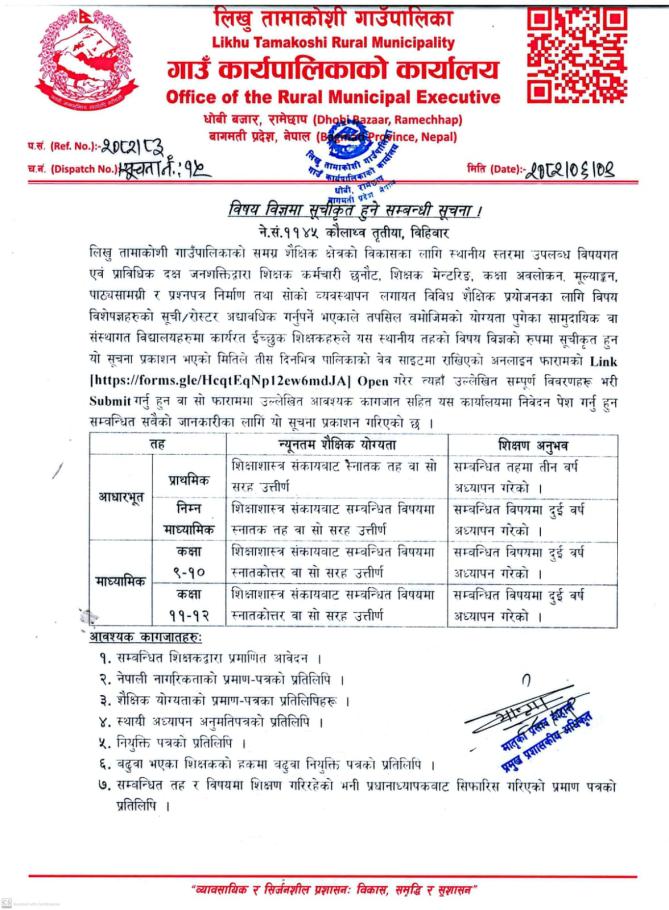 विषय विज्ञमा सूचीकृत हुने सम्बन्धी सूचना ।