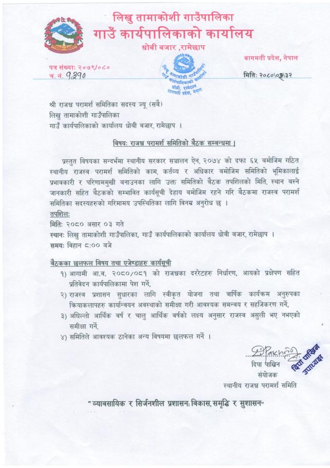 राजश्व परामर्श समितिको बैठक सम्बन्धमा । श्री राजश्व परामर्श समितिका सदस्य ज्यू (सबै)