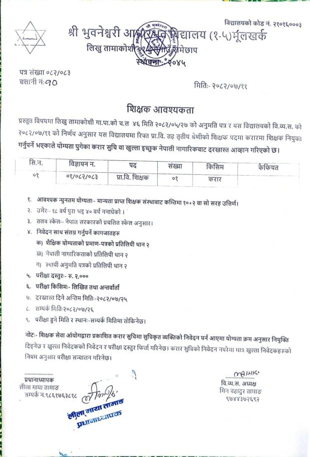 शिक्षक आवश्यकता सम्बन्धमा ।