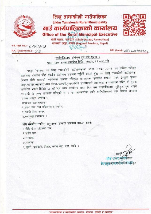 विउ मकै उत्पादन कार्यक्रम संचालनको लागी लाभग्राही छनौट गरिएको सुचना