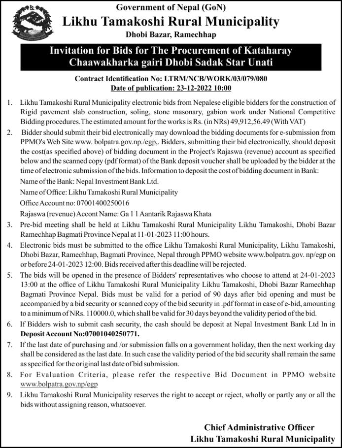 Invitation For Bids for The Procurement of Kataharay Chaawakharka gairi Dhobi Sadak Star Unati